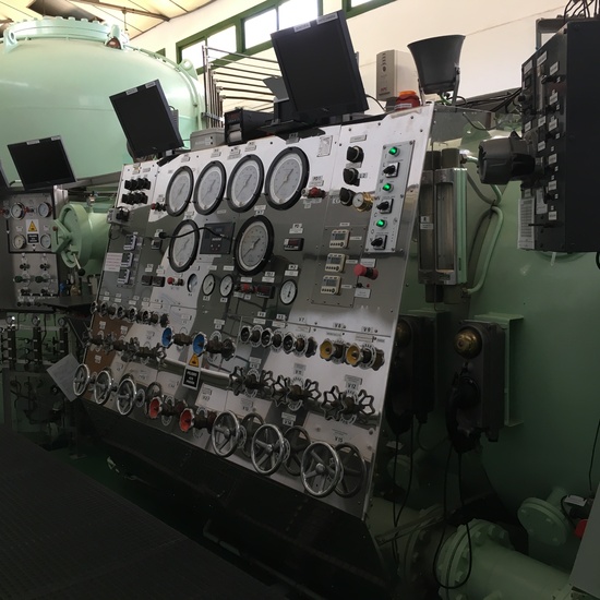 En el exterior (siempre tiene que haber un técnico especializado en tecnología hiperbárica) se sitúan los paneles de control, los barómetros, las botellas de gas, es decir, todo lo que tiene que ver con el con el control y la seguridad de la cámara hiperbárica y de sus ocupantes.